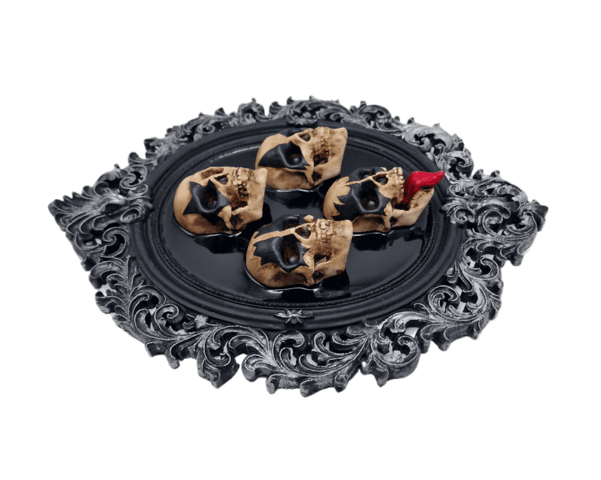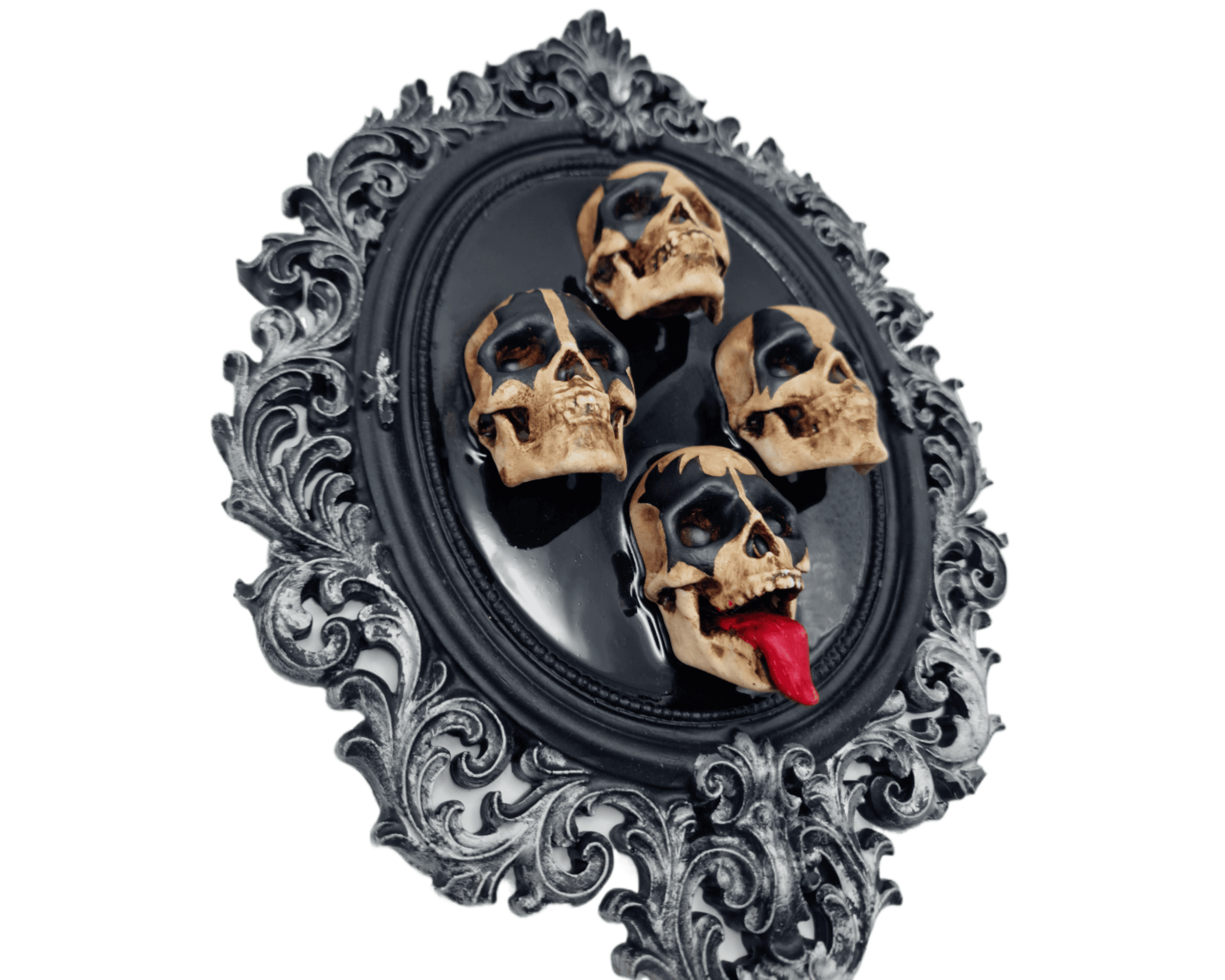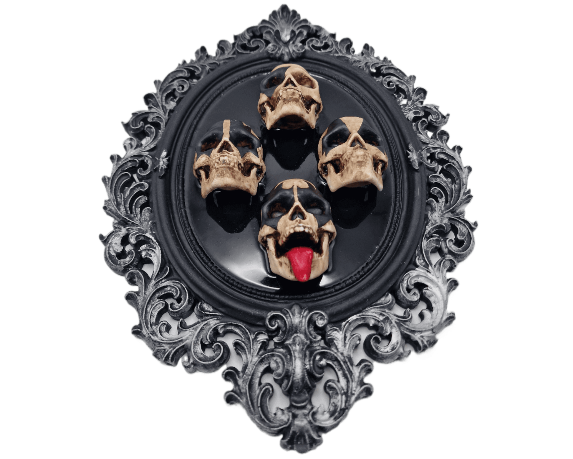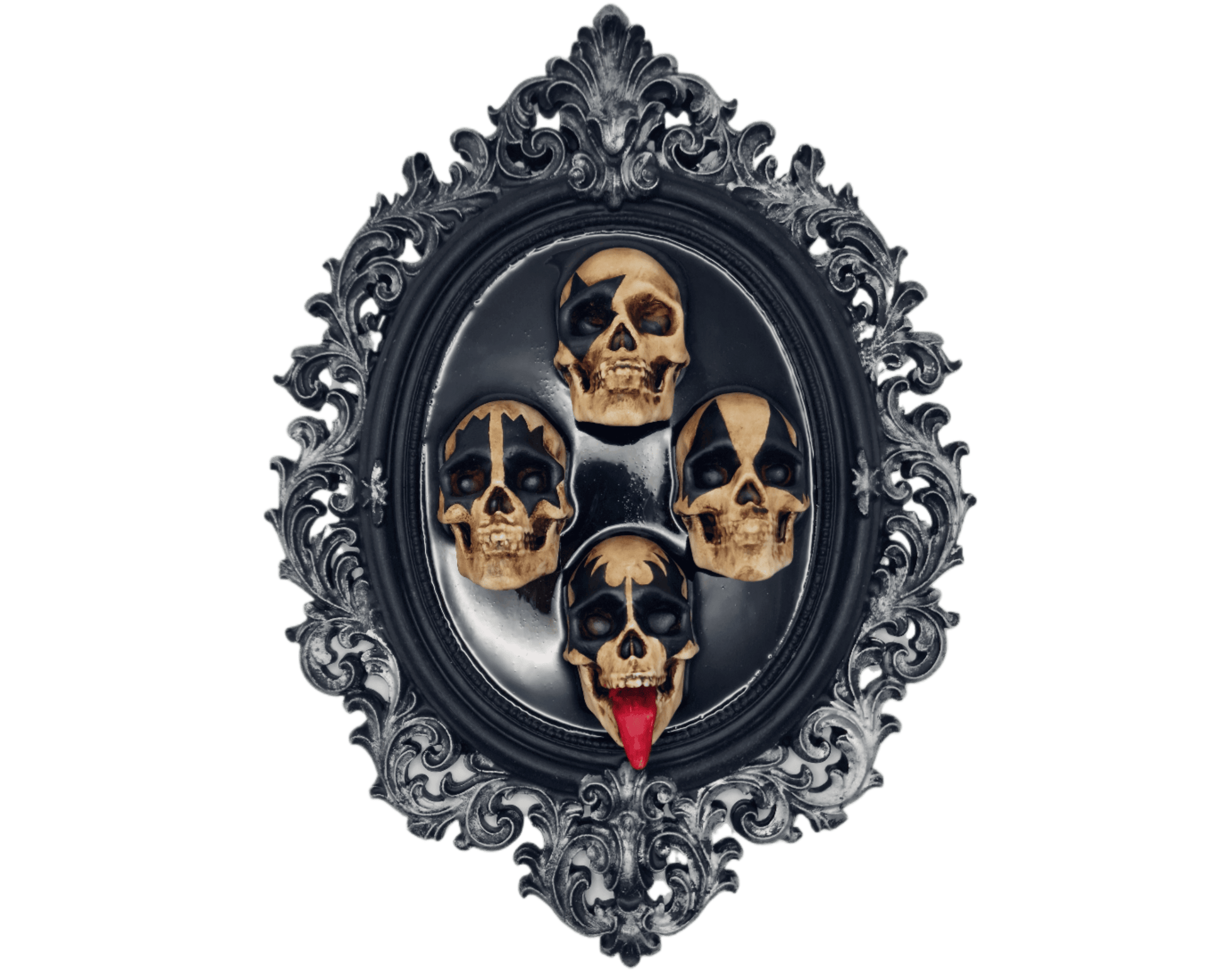 Añade un toque de rock oscuro y teatral a tu espacio con este cuadro de marco gótico que presenta cuatro calaveras, evocando la fuerza y el carácter de los iconos del rock clásico. Cada calavera está creada en resina y pintada a mano, resaltando los detalles faciales, las expresiones dramáticas y el contraste con el fondo negro profundo.