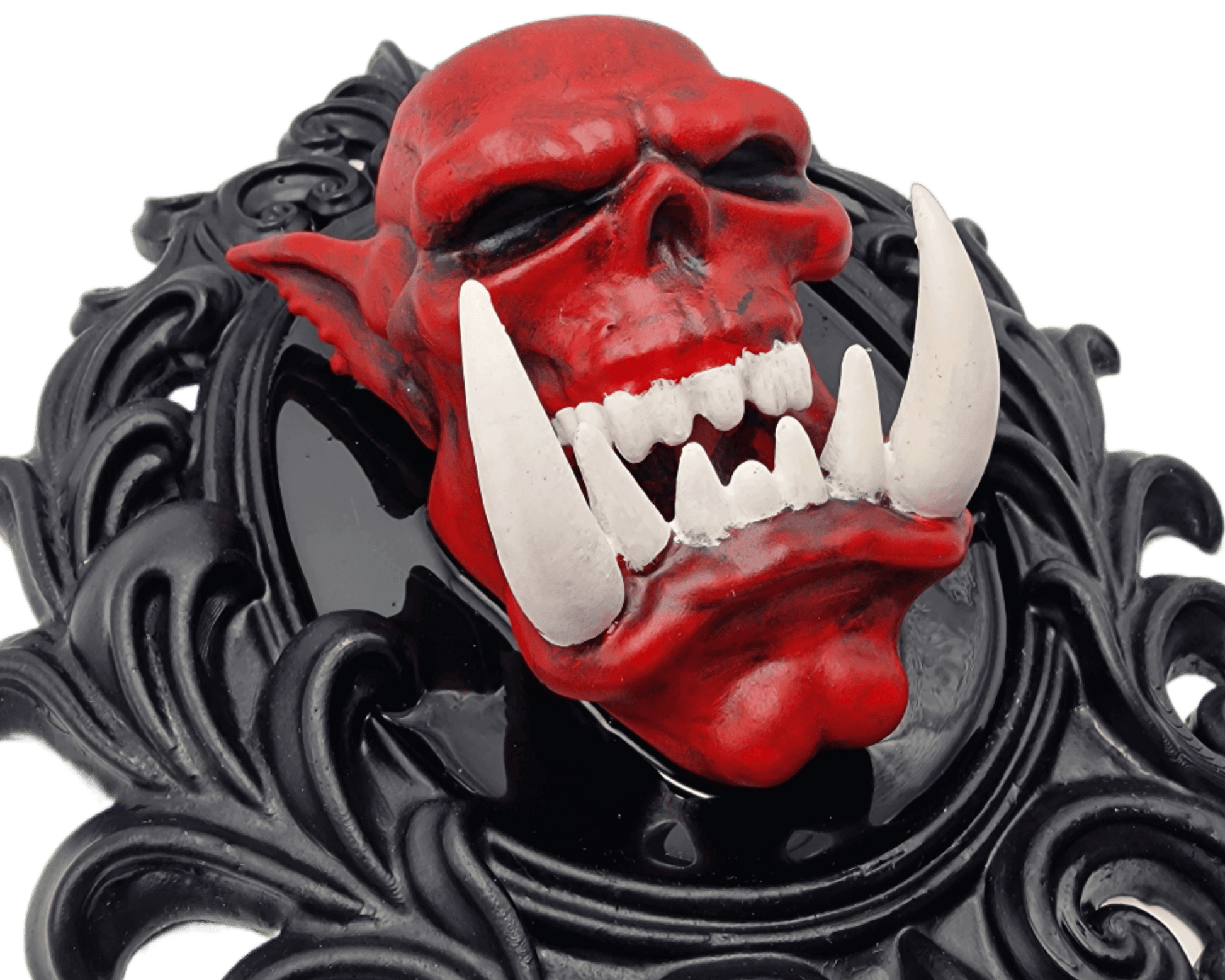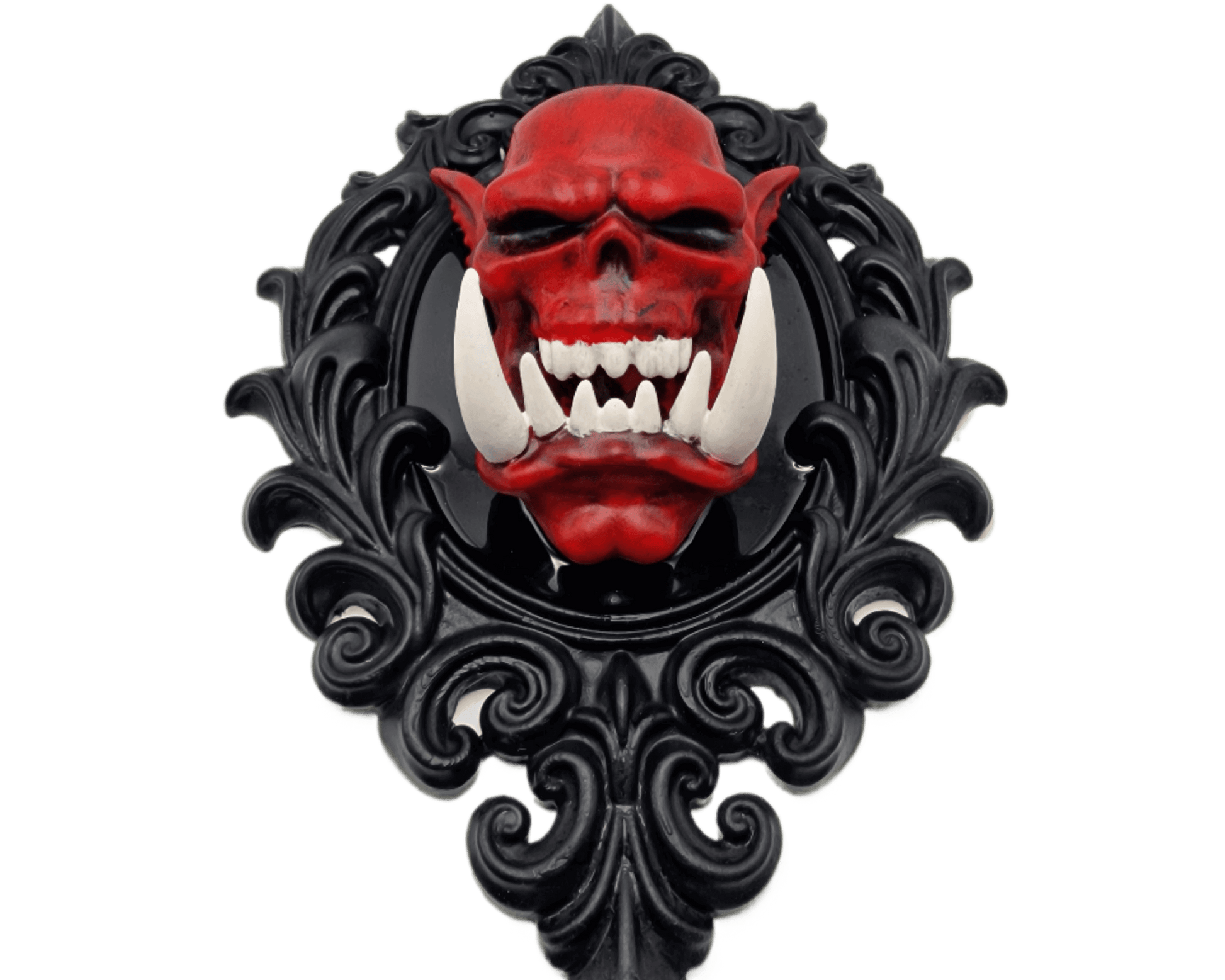 Añade un toque de fantasía oscura a tu espacio con este cuadro de marco gótico que presenta el cráneo de un orco rojo con colmillos blancos. La pieza está creada en resina y pintada a mano, destacando cada detalle sobre un fondo negro que aporta profundidad y dramatismo.