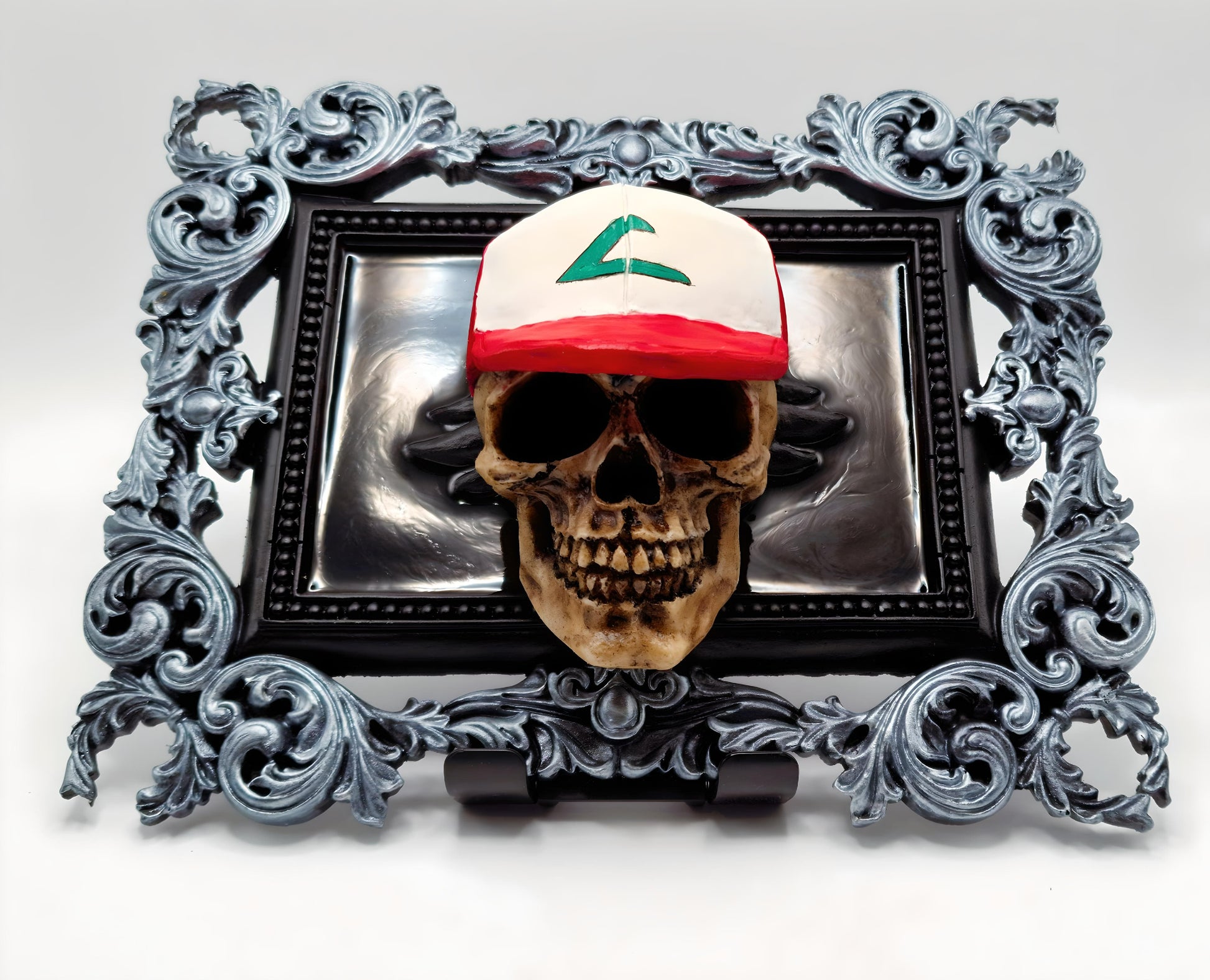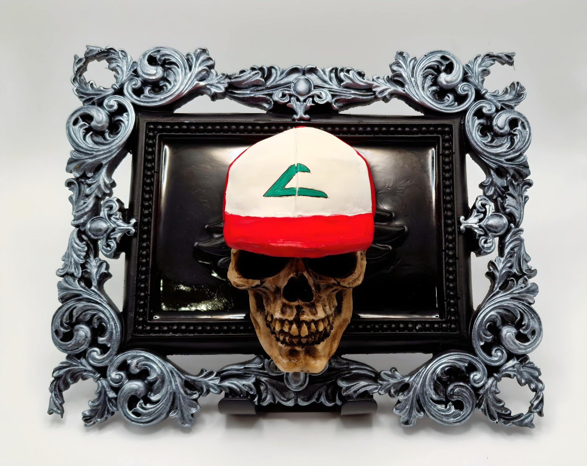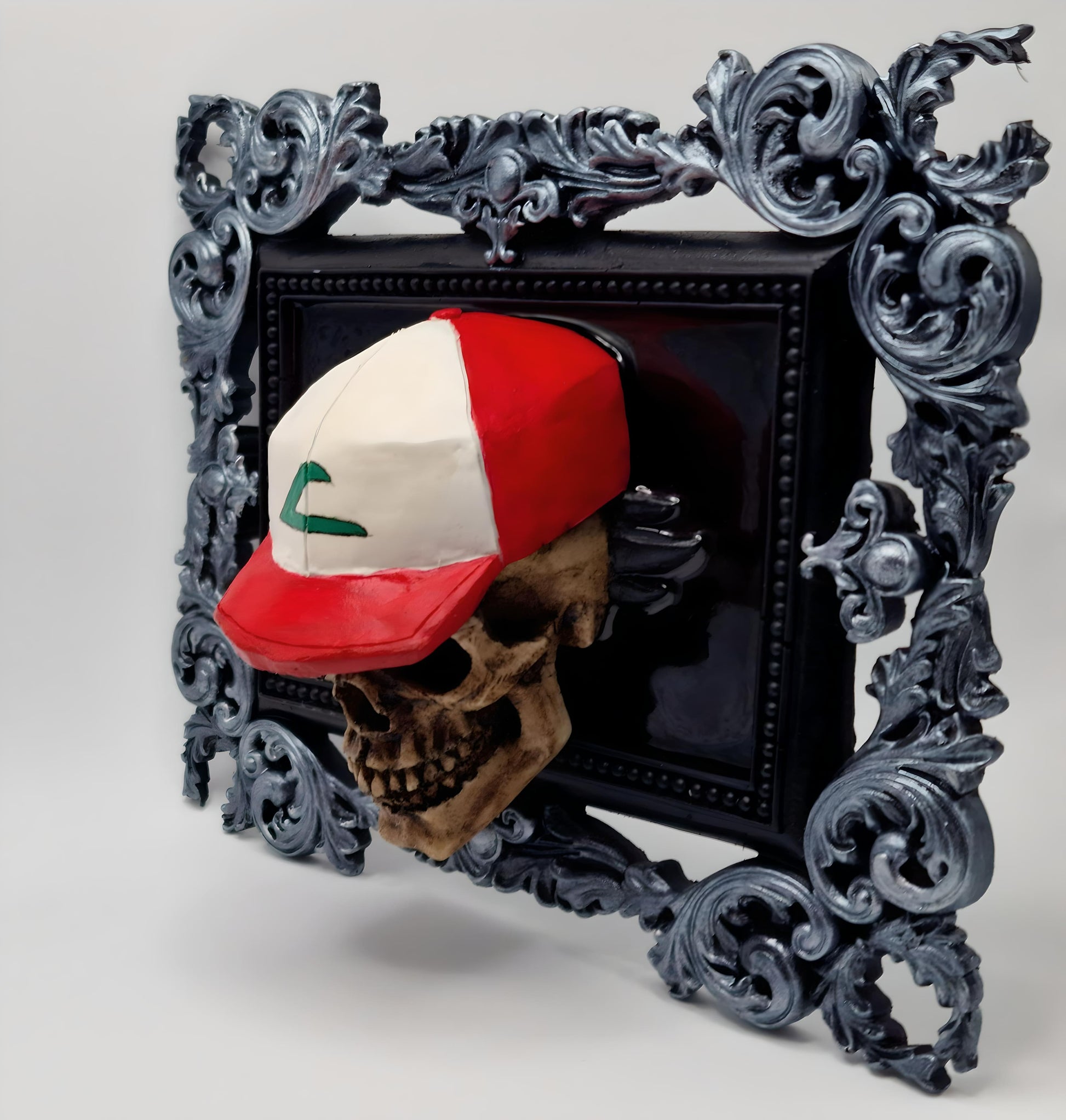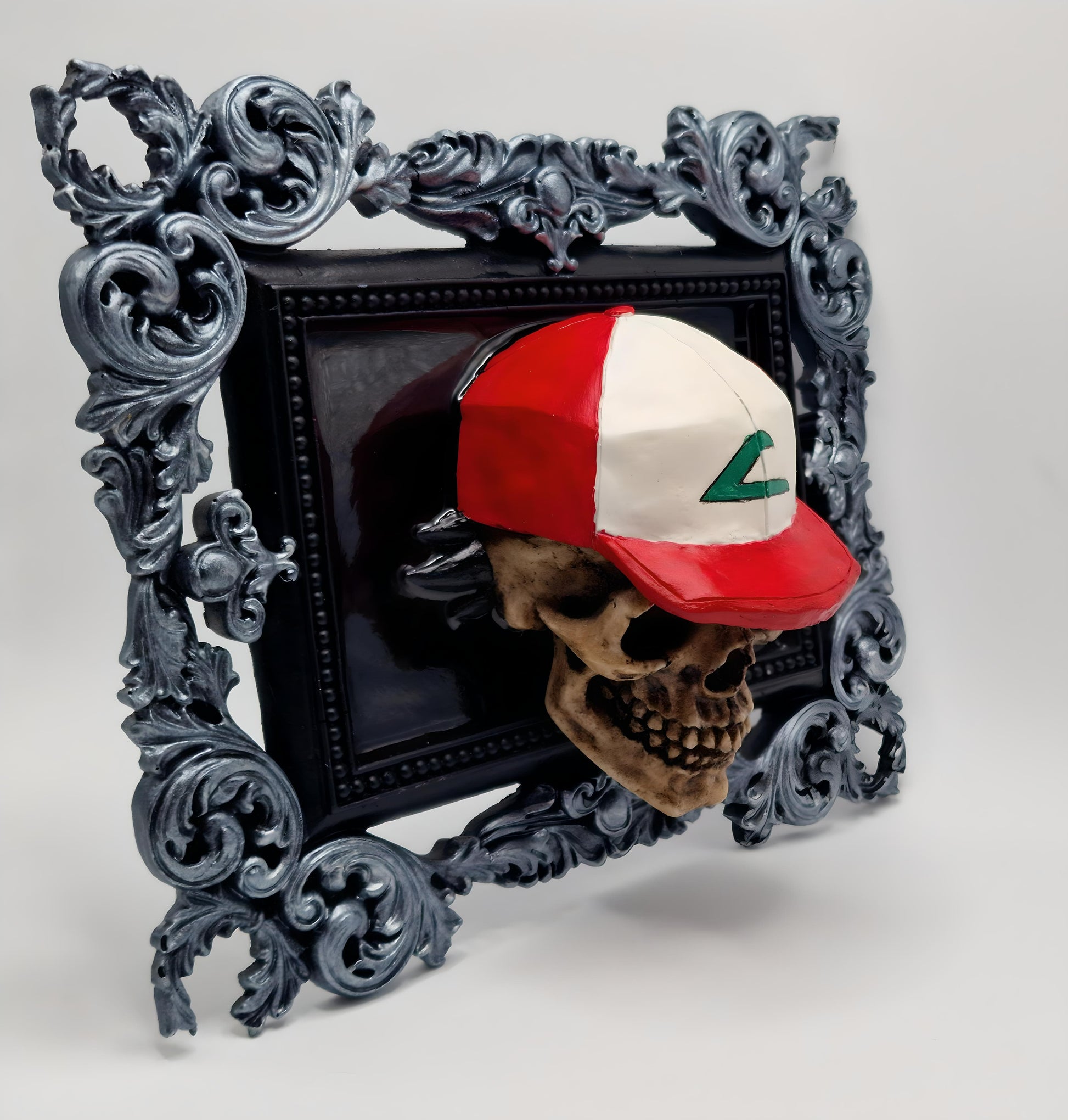 "El Legado del Entrenador" está cuidadosamente enmarcado en un marco barroco negro con detalles plateados, donde el cráneo, coronado con la icónica gorra de Ash, emerge con un aura de nostalgia y misticismo. La gorra, símbolo de determinación y aventura, contrasta con la solemnidad del cráneo, evocando el fin de un ciclo, pero también la permanencia de un legado. Esta pieza fusiona lo clásico con lo contemporáneo, ideal para los amantes de las aventuras épicas y la perseverancia inquebrantable.